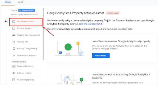 - Under Property, click GA4 Setup Assistant and create a new Google Analytics 4 property: