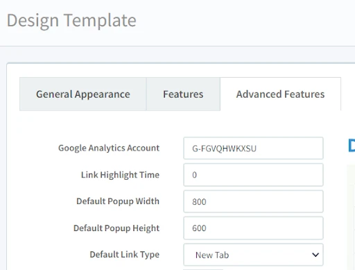 Within DCatalog’s Design Template→ Advanced Features tab, replace the UA number with the Measurement ID: